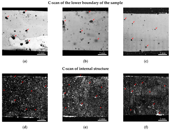 Ultrasonic studies of the internal microstructure of polyethylene-based composite films with different concentrations of natural rubber showed that, regardless of the presence of filler, microscopic air cavities (bubbles) are present in the volume of the samples. The results are shown in Figure 4. Extended air cavities seen as dark acoustic shadows in C-scans of lower boundary of the samples (Figure 4a–c).