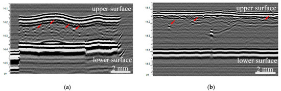Ultrasonic vertical images of the original samples: LDPE/NR 90/10 (a), LDPE/NR 50/50 (b). Arrows are filler agglomerates.