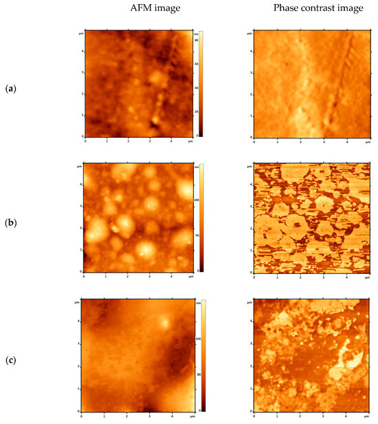 Surface roughness is an important topographical characteristic of a material’s surface, which plays a key role in the ability of microorganisms to adhere to the surface. The arithmetic mean roughness (Ra) and the root mean square deviation of the profile height from the mean line (Rq) are shown in Table 4 and clearly demonstrate the change in the micro-relief of the surface [43]. The introduction of NR, regardless of concentration, leads to a decrease in Ra and Rq, which indicates a narrowing of the height distribution function and a smoother surface.