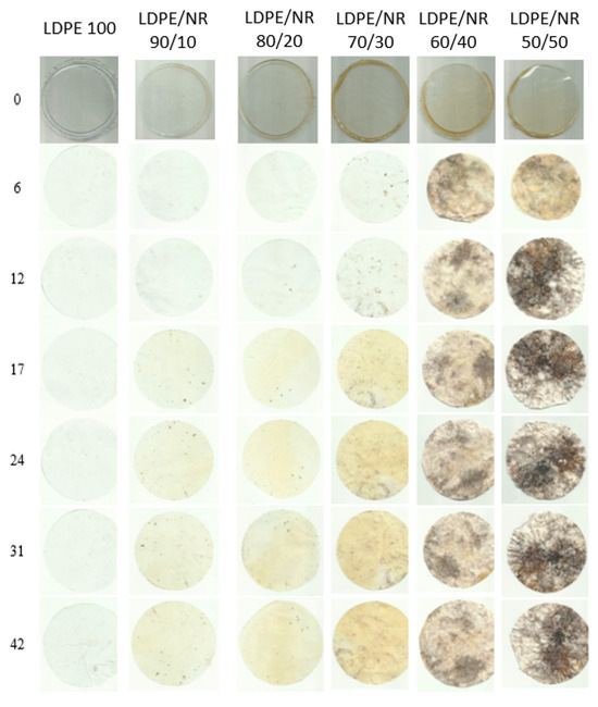 Photographs of samples of LDPE/NR compositions with NR contents of 0, 10, 20, 30, 40, and 50% before and after 6, 12, 17, 24, 31, and 42 months of exposure in laboratory soil.