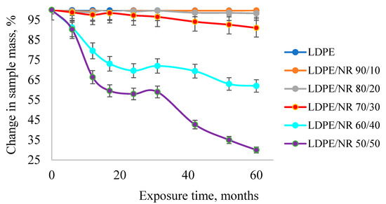 In summary, film composite materials based on LDPE and with varying NR contents were produced using the pressing method. An interpenetrating “network-in-network” system with maximum thermodynamic stability was obtained for composites with a rubber content of over 30%. The effect of natural rubber on the polyethylene matrix was determined. The best combination of performance properties was achieved by forming an interpenetrating “network-in-network” structure with 40 and 50% natural rubber, including a 32% increase in surface hydrophilicity and satisfactory physical and mechanical parameters (tensile strength, relative elongation), which allows NR contents of 40 and 50% in LDPE/NR composites to be considered optimal in terms of performance properties. It was found that the largest surface area of the phase boundaries obtained in the sample with 50% natural rubber ensures more efficient water penetration throughout the sample volume. For the first time, a detailed analysis of the effect of natural rubber on the rate and nature of biodegradation of PE/NR composites in soil was conducted using the IR method. The accumulation of protein components on the surface of films with an NR content of over 30% over 24 months was demonstrated, accompanied by the cleavage of the double polyisoprene bond and the formation of oligomers with ketone and aldehyde groups. The dependence of mass loss of samples after aging in laboratory soil for 5 years was determined. The greatest mass loss was observed for the 50/50 LDPE/NR blend. The sample with a 50% natural rubber content lost 70% of its mass over 60 months, while the sample with a 40% NR content lost 38%. Blends with an NR content greater than 30% represent a “network within a network” system with a developed phase boundary. At low NR content, its phase is dispersed within the PE matrix. Large NR particles are encapsulated within the polyethylene matrix, making the rubber poorly accessible. For the first time, a decrease in the molecular weight of polyethylene in PE/NR composites after 5-year storage in soil was observed. A significant drop in all average Mm values occurred. Mz, Mw, and Mv were subject to the greatest decrease compared to Mn. The first three values decreased by approximately 70%, while Mn decreased by only 20%. A significant difference in the molecular weight distribution of 50/50 PE/NR composite samples stored and aged in soil for 5 years is evident.