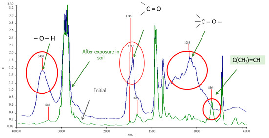 Regarding the compositions with NR, the thermal stability changed significantly after the five-year period in the soil. This is associated with the absence of NR in the tested samples and the presence of only LDPE, which underwent substantial degradation accompanied by chain scission and the accumulation of oxygen-containing functional groups.