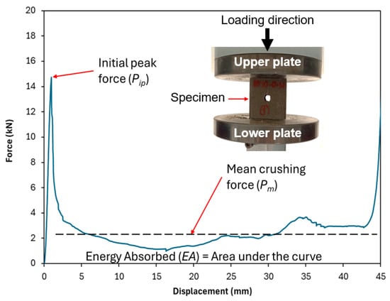 The crashworthiness performance of the tubes was assessed through quasi-static compression testing. This test provides valuable comparative data, allowing for a relative assessment of different designs. Furthermore, the tests reveal fundamental properties, such as the basic crushing mechanism and the stability of progressive failure. However, a limitation remains, as the material’s performance under quasi-static compression testing may differ from its behavior during an actual impact collision, as the high strain rates can cause increased brittleness, leading to a high peak force or catastrophic shattering instead of controlled, progressive crushing. In accordance with established testing protocols from previous studies on the crashworthiness of similar tubular structures, the crosshead speed was set to 5 mm/min. This speed was specifically chosen to replicate the quasi-static loading conditions [11,32]. Each specimen was placed between two rigid, flat steel plates and subjected to axial compression until reaching a predefined maximum displacement of 45 mm. This setup ensured uniform loading and minimized boundary effects that could influence the structural response. Throughout the testing process, force-displacement data were continuously recorded using a high-precision load cell and displacement sensor, ensuring accurate measurement of mechanical response parameters. As demonstrated in Figure 2, a representative force-displacement curve was obtained, capturing key crashworthiness characteristics. This real-time data acquisition facilitated a comprehensive analysis of the tubes’ structural behavior, including their load-bearing capacity, peak force, energy absorption capability, and failure mechanisms.