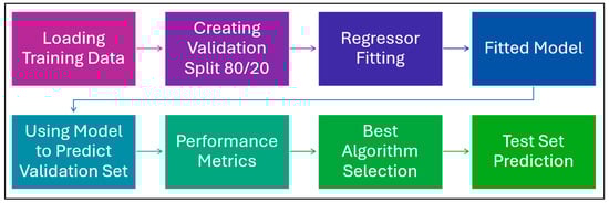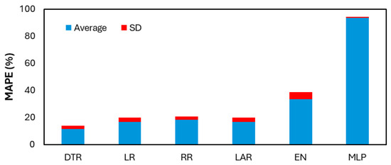 Each of the ML techniques was trained using a bootstrapping approach, where 10 different samples were generated with replacement, utilizing NumPy [35] random seeds ranging from 0 to 9. This approach ensured variability in the training process while maintaining consistency in reproducibility. Each sample contained a unique combination of training and validation splits, with the dataset partitioned into 80% for training and 20% for validation. This ratio was selected to balance model learning while retaining sufficient data for evaluating generalization performance. To assess the predictive accuracy of the ML models, two key error metrics were employed: the root mean squared error (RMSE) and the mean absolute percentage error (MAPE), as defined in Equations (4) and (5), respectively. These metrics were computed for each algorithm across the 10 generated samples, and the average validation RMSE and MAPE values were used as primary indicators of model performance [36].