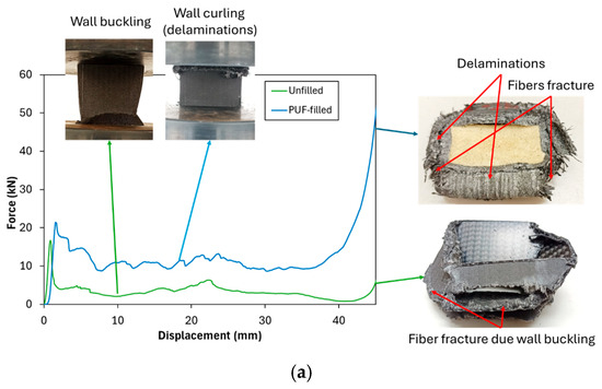 The experimental results declared that the addition of PUF to neat (unperforated) tubes resulted in a significant improvement in crashworthiness indicators compared to their unfilled counterparts. The presence of PUF contributed to an enhanced EA capacity and improved deformation control, both of which are crucial for increasing structural resistance under loading conditions. The addition of PUF to the inner part of the CFRP tube has ability to support the wall and prevent the localized buckling in the wall of the tube. The Pm and EA of neat PUF-filled tubes exhibited an approximately three-fold increase relative to the unfilled tubes, demonstrating the effectiveness of PUF in reinforcing structural integrity. Furthermore, the failure mode of the tubes underwent a notable transformation. In unfilled tubes, failure was primarily characterized by localized wall buckling. Meanwhile, in PUF-filled tubes, the failure mechanisms evolved to include curling, delamination, and fiber fracture [45], as depicted in Figure 4a. These latter-mentioned failure modes generally require higher force levels, leading to a significant enhancement in EA. The increased resistance to deformation in PUF-filled tubes underscores the beneficial role of PUF as a reinforcement material in CFRP that fails by localized buckling, making it a viable solution for improving crashworthiness in structural applications.