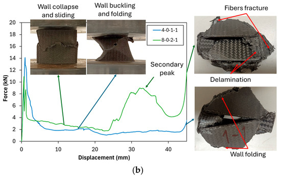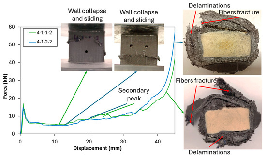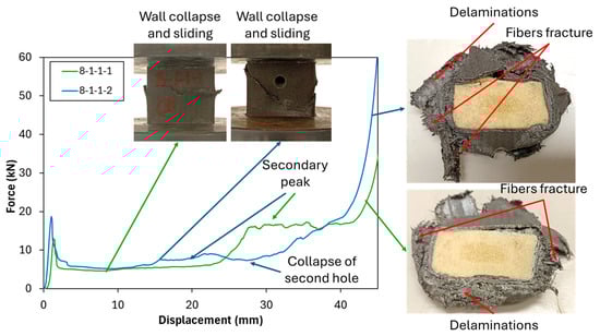 Meanwhile, the introduction of holes in unfilled tubes influenced all crashworthiness indicators differently depending on the hole size. Specifically, at a 4 mm hole diameter (4-0-1-1), a reduction in all crashworthiness indicators was observed. The reduction occurs because adding a 4 mm hole does not alter the failure mode but instead reduces the buckling force, as explained by the decrease in Pm compared to the neat unfilled tube (0-0-0-0), as can be seen in Table 4 and Figure 4b. However, at 6 mm and 8 mm hole diameters, the crashworthiness indicators exhibited an increasing trend, suggesting a complex interaction between structural integrity and localized stress distribution. As shown in Figure 4b, the 8-0-2-1 configuration demonstrated that failure mode alteration occurs. The failure was initiated with a wall collapse due to micro-buckling at the hole site, causing the cross-section to separate into upper and lower parts; however, it remained aligned without wall bending. This initial collapse was followed by wall sliding between the upper and lower sections of the tube. Once the collapsed portion of the tube reached the compression plate, the load increased again, producing a secondary peak. Fiber fracture and slight delamination appeared as a result of the wall sliding process. These behaviors contributed to an improvement in both the mean crushing force (Pm) and the energy absorption (EA).