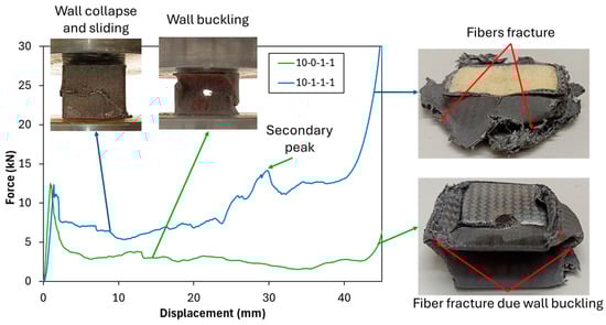 A direct comparison between different tube configurations highlights the positive impact of PUF filling on crashworthiness indicators, particularly in hole configurations 10-0-1-1 and 10-1-1-1. In these configurations, the inclusion of PUF led to notable improvements in Pm and EA. The observed deformation mechanism reveals that, in the 10-0-1-1 configuration (unfilled tube), wall buckling similar to that of the neat unfilled tube was observed. Meanwhile, in 10-1-1-1 configuration (PUF-filled tubes), micro-buckling is the initial mode of wall collapse on the hole area [46], followed by wall sliding, as illustrated in Figure 5. Furthermore, the configuration exhibited a secondary peak load, attributed to wall sliding that then contacted the compression surface, leading to an increase in load and consequently enhancing both the Pm and EA. These suggest that PUF filling plays an essential role in stabilizing the deformation process by mitigating buckling and bending, thereby enhancing the uniformity of energy dissipation during compression. The presence of PUF effectively redistributes the crushing forces throughout the tube structure, stabilizing the walls and reducing wall buckling, which in turn enhances crashworthiness performance. By reinforcing the tube’s structural integrity, PUF filling ensures a more controlled and progressive energy dissipation mechanism, making it an effective strategy for improving the impact resistance of lightweight structural components.