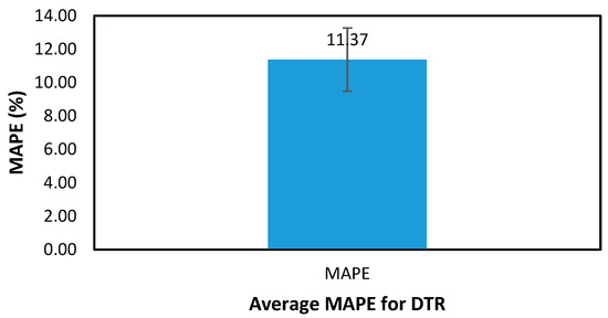 Confidence interval across samples of the best performing algorithm is shown in Figure 8 for the MAPE results, where the average is 11.37 ± 1.89. This creates a confidence interval for MAPE values of DTR in the range (9.48, 13.26), which demonstrates the robustness of the results.