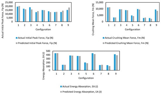 It is important to note that Table 2 presents input parameter combinations that differ from those in the training set. This deliberate variation allows the ML models to generalize beyond the trained data, enabling the prediction of crashworthiness indicators for new, unexplored configurations. By leveraging ML predictions, the need for conducting additional physical experiments for these new combinations is minimized, thus reducing time, cost, and resource consumption. The best-performing ML technique based on the validation results was used to predict the outputs, Pip, Pm, and EA. The accuracy and reliability of these predictions were further examined and validated in the results section, where a comparative analysis between predicted and actual experimental values was conducted.