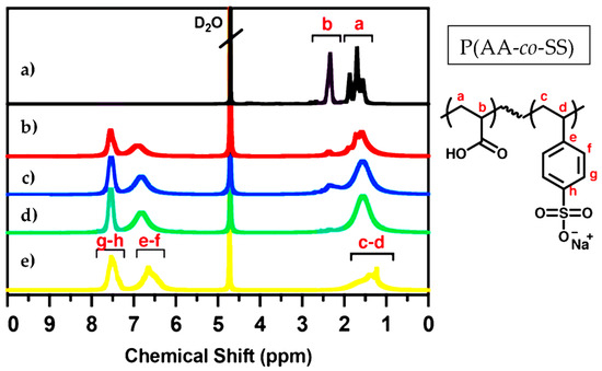 1H-NMR spectra of PAA, PSS and P(AA-co-SS) copolymers. (a) PAA, (b) P(AA-co-SS) (70:30), (c) P(AA-co-SS) (50:50), (d) P(AA-co-SS) (30:70), (e) PSSNa. Deuterium oxide (D2O) was used as the deuterated solvent. The 1H-NMR spectra reveal characteristic aliphatic and aromatic proton signals corresponding to the P(AA-co-SS) copolymers. The letters a–h denote the proton assignments in the chemical structure of P(AA-co-SS).