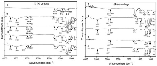FTIR spectra of homo- and copolymer P(AA-co-SS) EPF meshes produced under positive (+) and negative (−) applied voltages. (Ia,IIa) PAA, (Ib,IIb), P(PAA-co-PSS) 70:30, (Ic,IIc) P(PAA-co-PSS) 50:50, (Id,IId) P(PAA-co-PSS) 30:70, and (Ie,IIe) PSS.