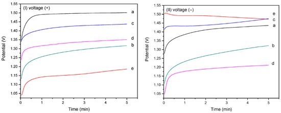 Figure 5(I,II) present the chronopotentiometric behavior of the homo- and copolymer EPF meshes on the CaOx EC under applied positive (+) or negative (−) voltages, respectively. The CaOx crystals formed on the ITO surface are non-conductive and act as barriers to oxygen diffusion, leading to a decrease in the measured potential (V), as shown in Figure 5. In Figure 5I, the potential (V) during CaOx EC is highest for PAA (Figure 5Ia). The P(AA-co-SS) copolymer meshes show intermediate potential values compared with the PAA and PSS homopolymers, as seen in Figure 5(Ib) (70:30), Figure 5(Ic) (50:50), and Figure 5(Id) (30:70). In contrast, the PSS mesh exhibits the lowest potential value during CaOx EC (Figure 5(Ie)).