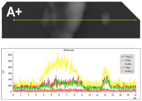 Figure 7 shows the results of an SEM-EDS microanalysis of a linear record of the CaOx crystals obtained on the ITO in the presence of PSS when a (+) voltage is applied. This analysis revealed the presence of the carbon (C), oxygen (O) and calcium (Ca) elements from the CaOx, as well as sulfur (S) and sodium (Na) from the PSS.