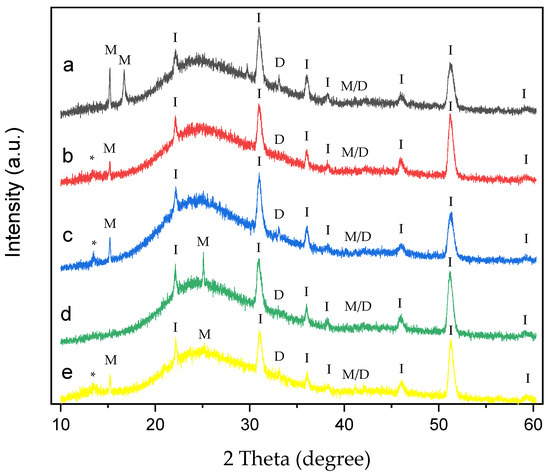 XRD of CaOx crystals grown on ITO with homo- and copolymer EPF under negative (3−) applied voltage. (a) PAA, (b), P(PAA-co-PSS) 70:30, (c) P(PAA-co-PSS) 50:50, (d) P(PAA-co-PSS) 30:70, and (e) PSS. The peak designations of I, M, D, M/D and * correspond to the ITO substrate, COM, COD, COM/COD and unassigned signals, respectively.