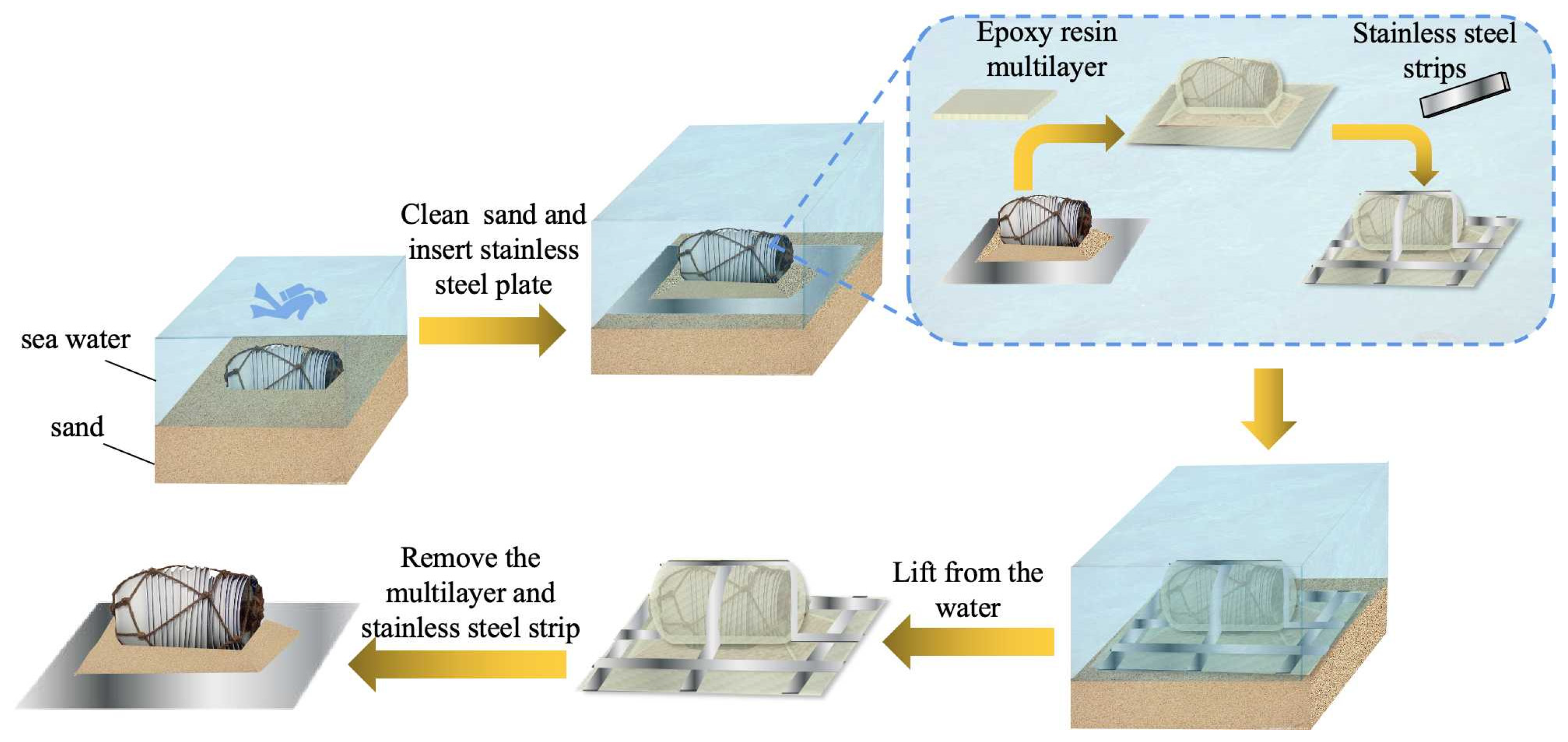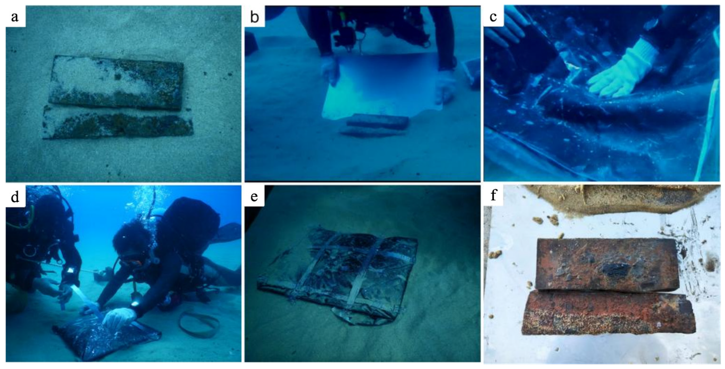 - Chen, X.; Xie, L.; Wang, F.; Wu, Y.; Zhang, B.; Zhu, L. Temporary consolidation and packaging of fragile cultural relics at underwater archaeological sites to maintain their original state during extraction. Archaeometry 2020, 62, 1067–1077. [Google Scholar] [CrossRef]