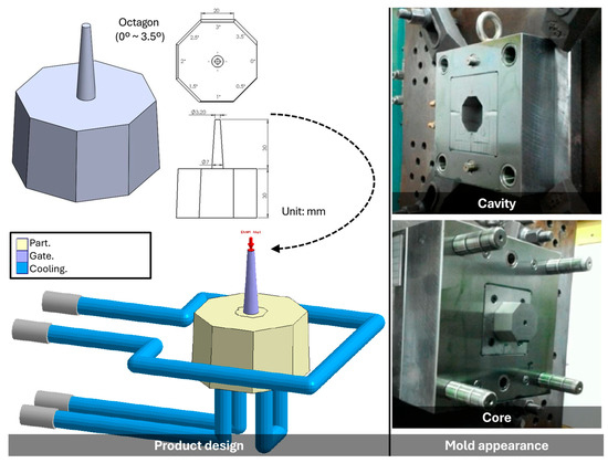 To investigate the effects of draft angle on surface quality and dimensional accuracy, specimens of PP, POM, ABS, and PC were molded using a specially designed tool incorporating multiple draft angle geometries (Figure 2). The specimen was configured as an octagonal prism with an overall height of 30 mm (excluding the sprue).