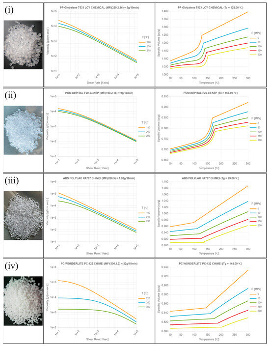 Schematic of viscosity and P-V-T relation of experiment materials: (i) polypropylene (PP); (ii) polyoxymethylene (POM); (iii) acrylonitrile-butadiene-styrene (ABS); (iv) polycarbonate (PC). (Source: Moldex3D Information Library).