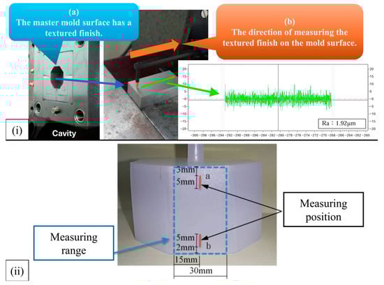 Schematic of the surface roughness measurement of the finished product after molding: (i) mold surface measurement; (ii) specimen surface measurement.