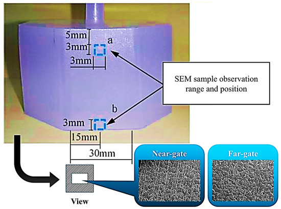 In Figure 4i, the master mold cavity surface was fabricated with a textured finish, and its reference roughness was characterized prior to molding using a profilometer along the indicated direction, yielding a baseline roughness value of approximately Ra of 1.92 μm. This ensured that the mold surface quality was well defined before evaluating replication on the molded parts. In Figure 4ii, the measuring range and positions on the specimen surface are indicated. Roughness was measured at two specific locations: (a) near the top edge (5 mm below the sprue) and (b) near the bottom edge (5 mm from the base), with a vertical measuring span of 30 mm. On the other hand, Figure 5 shows the regions selected for scanning electron microscopy (SEM) observation of the replicated surface textures. Two specific areas were analyzed: (a) the near-gate region, located approximately 5 mm below the gate, and (b) the far-gate region, located near the bottom edge, 15 mm from the gate. Each observation area covered approximately 3 mm × 3 mm to ensure representative sampling of the surface morphology.