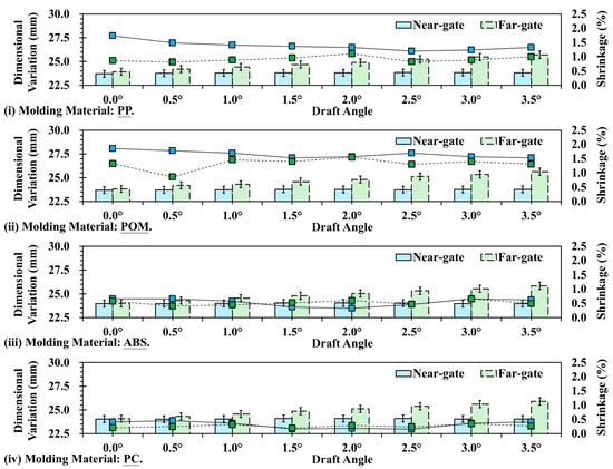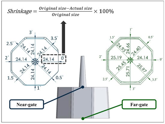 Figure 6 illustrates the schematic of dimensional measurement used for shrinkage evaluation. The left-hand side depicts the original geometric design of the specimen and sprue. Dimensional measurements were taken radially outward from the center of the part, where the origin was defined at (X: 0, Y: 0). For instance, the distance from the center to the 0° draft angle position (X: 24.14, Y: 0) was recorded. Measurements were conducted at both the near-gate (adjacent to the sprue) and far-gate (end of flow) regions, totaling sixteen reference points. After molding and cooling, the actual specimen widths at the near-gate and far-gate positions were measured, and the deviations from the designed cavity dimensions were calculated to determine linear shrinkage. This measurement strategy established a direct correlation between draft angle and polymer type with respect to dimensional accuracy. The octagonal geometry facilitated consistent evaluation across all draft angles (0–3.5°), while comparison between near-gate and far-gate regions revealed the influence of local flow and cooling gradients on shrinkage behavior. To ensure the accuracy and representativeness of the measurements, five specimens are randomly selected for measurement, and the averages are calculated along with their standard errors. The detailed outcomes are presented in Table 2. Given the uncomplicated geometry of the final specimen and the precise measurement technique employed, the likelihood of errors is minimal.