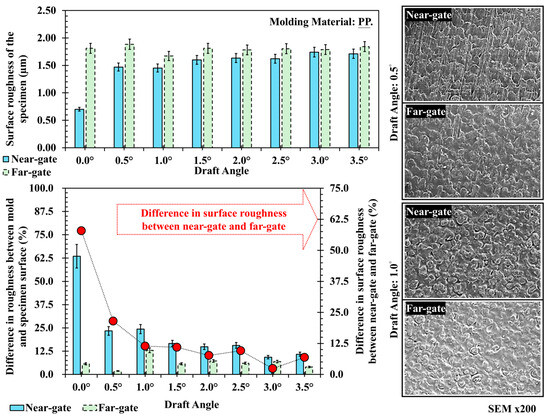 Trend chart and scanning electron microscope image of surface roughness at different draft angles and measurement positions for PP, and its difference in surface roughness between near-gate and far-gate (dotted-line).