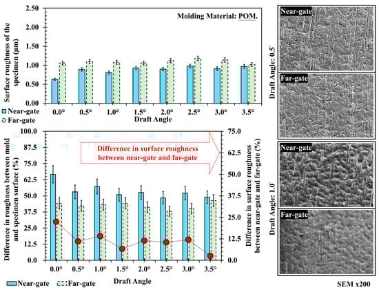 Trend chart and scanning electron microscope image of surface roughness at different draft angles and measurement positions for POM, and its difference in surface roughness between near-gate and far-gate (dotted-line).