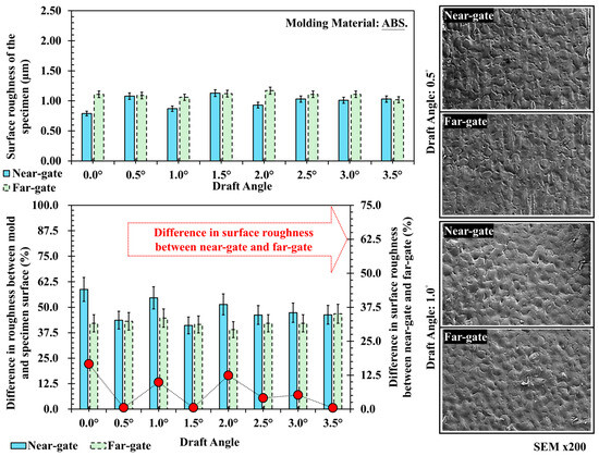 Trend chart and scanning electron microscope image of surface roughness at different draft angles and measurement positions for ABS, and its difference in surface roughness between near-gate and far-gate (dotted-line).