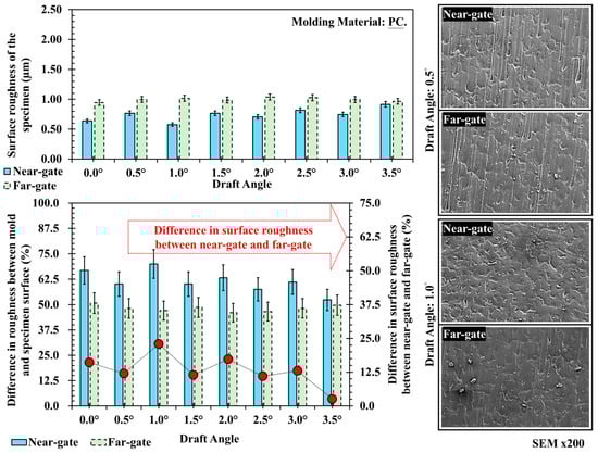 Trend chart and scanning electron microscope image of surface roughness at different draft angles and measurement positions for PC, and its difference in surface roughness between near-gate and far-gate (dotted-line).