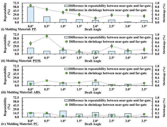 Figure 12 shows a comparison of surface texture replication differences and shrinkage differences between the near-gate and far-gate regions of four materials under various draft angles. This comparison enables the simultaneous observation of how draft angle influences the consistency of surface texture and dimensional deformation, while also reflecting the differences between crystalline and amorphous materials. For PP, at a 0° draft angle, the replication difference exceeds 50%, and the shrinkage difference is also at a high level, indicating significant disparities between the near- and far-gate regions. As the draft angle increases, both values decrease and stabilize beyond 2°, maintaining differences below 10%. This corresponds to the semi-crystalline nature of PP, where increasing draft angle reduces demolding friction, leading to improved consistency in surface texture and dimensional shrinkage (Figure 12i). For POM, the initial replication and shrinkage differences are lower than those of PP but exhibit a similar trend. At 0°, the difference is about 25%, which gradually decreases with increasing draft angle and reaches a minimum at 1.5–2.0° (Figure 12ii). This indicates that although POM is a highly crystalline material, its shrinkage is more uniform, and an appropriate draft angle further reduces near- and far-gate discrepancies, thereby improving consistency. In contrast, ABS exhibits generally low difference values, with a notable peak of over 35% appearing around 2.0°, while at most other draft angles the differences remain within 10% (Figure 12iii). This reflects the amorphous nature of ABS, which undergoes low and stable cooling shrinkage. Its texture replication primarily depends on mold surface precision and filling pressure rather than draft angle. However, localized variations may still occur due to subtle differences in flow balance, gate pressure, or demolding friction at specific regions of the cavity. These factors can locally alter melt velocity, surface wetting, or cooling uniformity, leading to slight deviations in texture depth or gloss. Furthermore, PC shows fluctuating curves for both replication and shrinkage differences, ranging between 10% and 30%, without a significant decline as the draft angle increases (Figure 12iv). This suggests that PC, as an amorphous engineering plastic, possesses excellent dimensional stability, yet its higher molding temperature may intensify local frictional heating or uneven cooling near ejector pins and cavity corners, resulting in minor surface inconsistencies. Consequently, the influence of draft angles on PC remains relatively limited compared with that of localized flow and thermal effects.