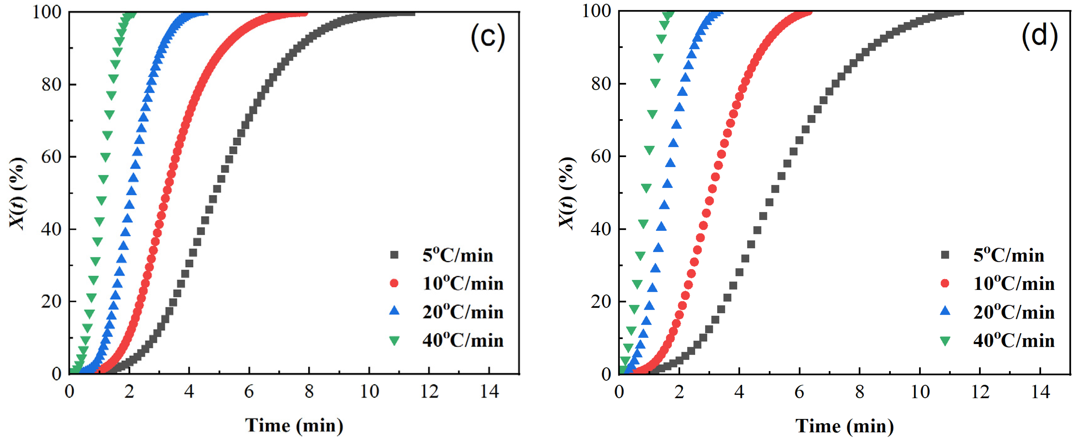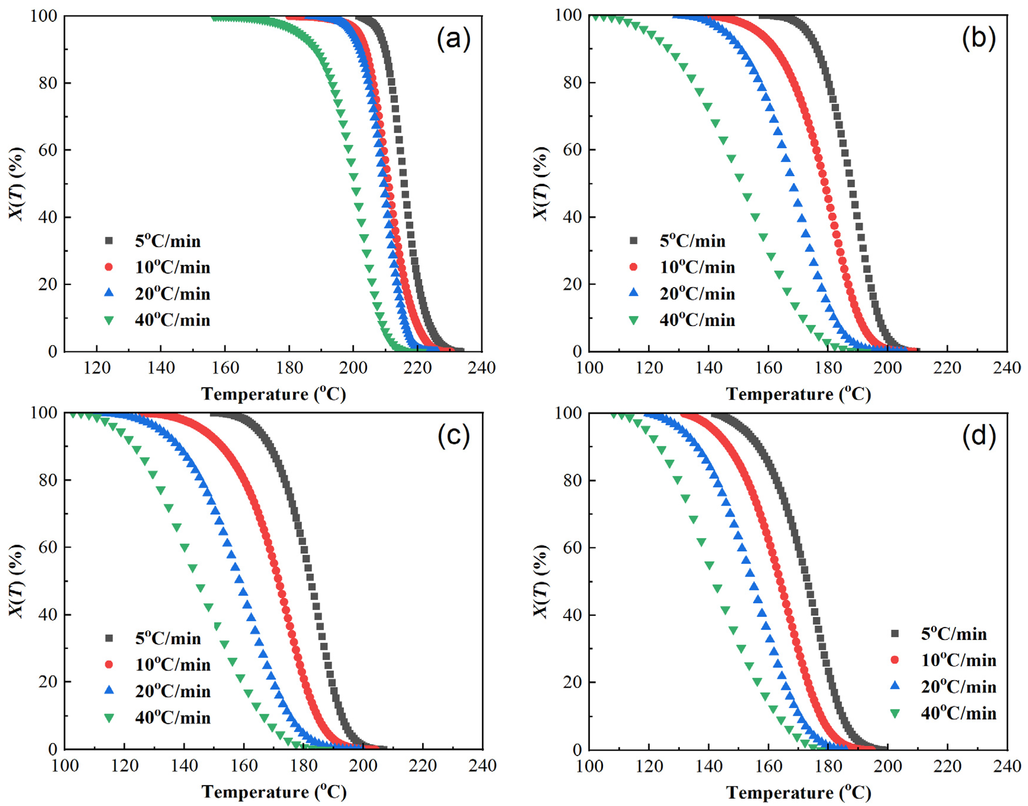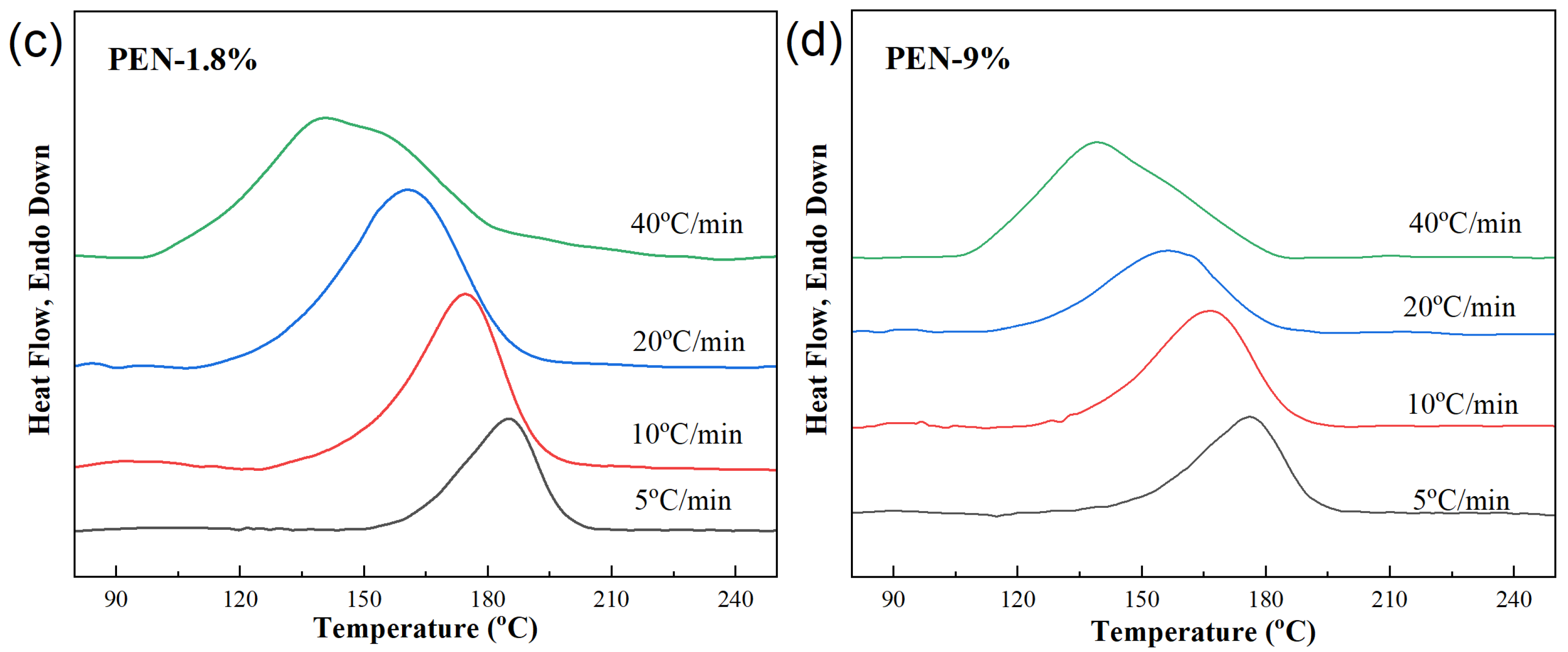 - Decreased starting temperature T0 and peak temperature Tc of crystallization: As shown in Figure 3 and Table 4, at a cooling rate of 10 °C/min, when the PEN content increases from 0% to 9%, T0 decreases from 230.3 °C to 194.5 °C and Tc decreases from 211.1 °C to 166.5 °C, indicating that the introduction of PEN makes crystallization more difficult and reduces the temperature required to initiate crystallization.