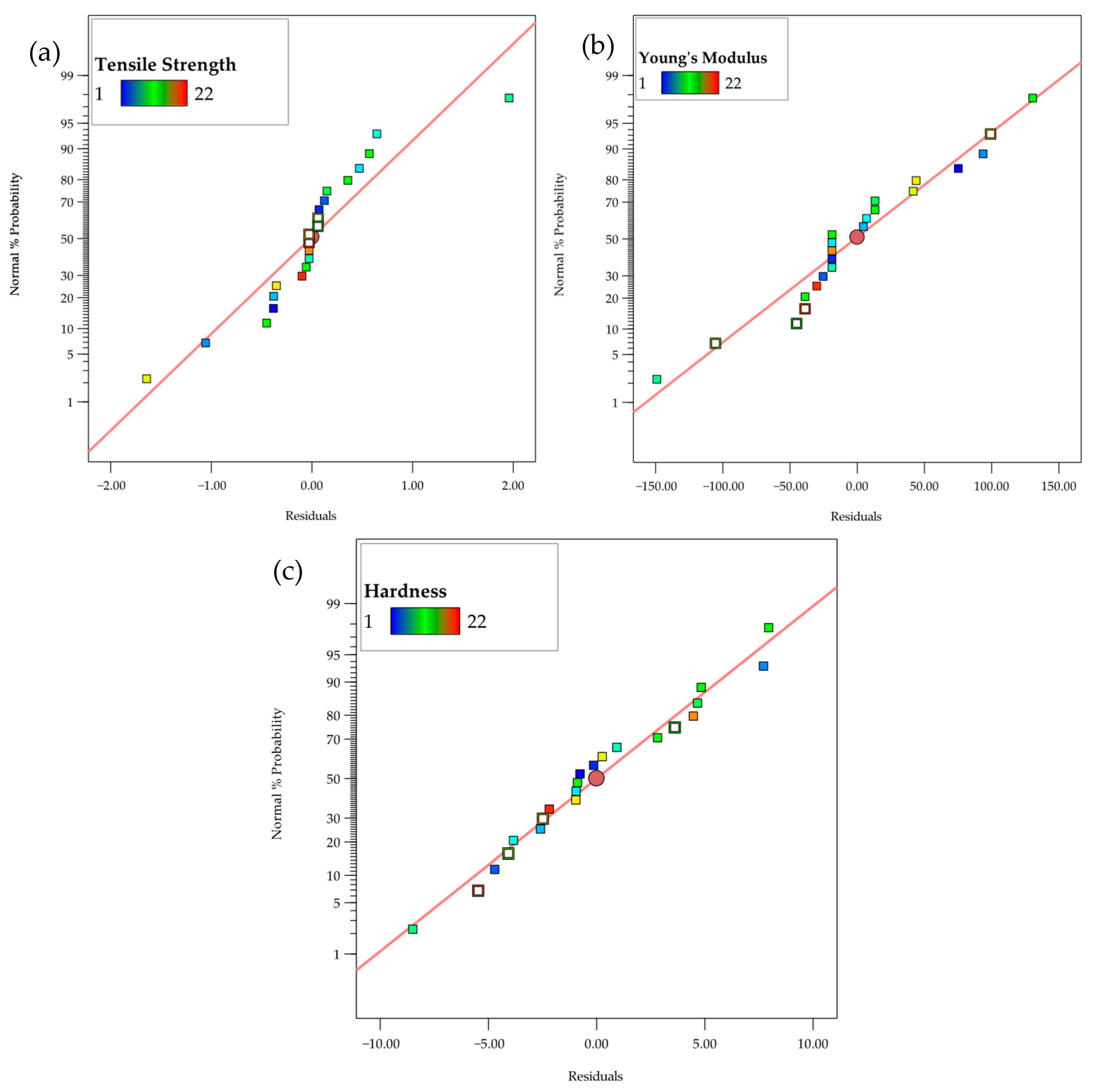 | Run | (F1) (Wt.%) | (F2) (°C) | (F3) (mm/s) | (F4) (Deg.) | (F5) (mm) | Tensile Strength (MPa) | Young’s Modulus (MPa) | Hardness (HV) |