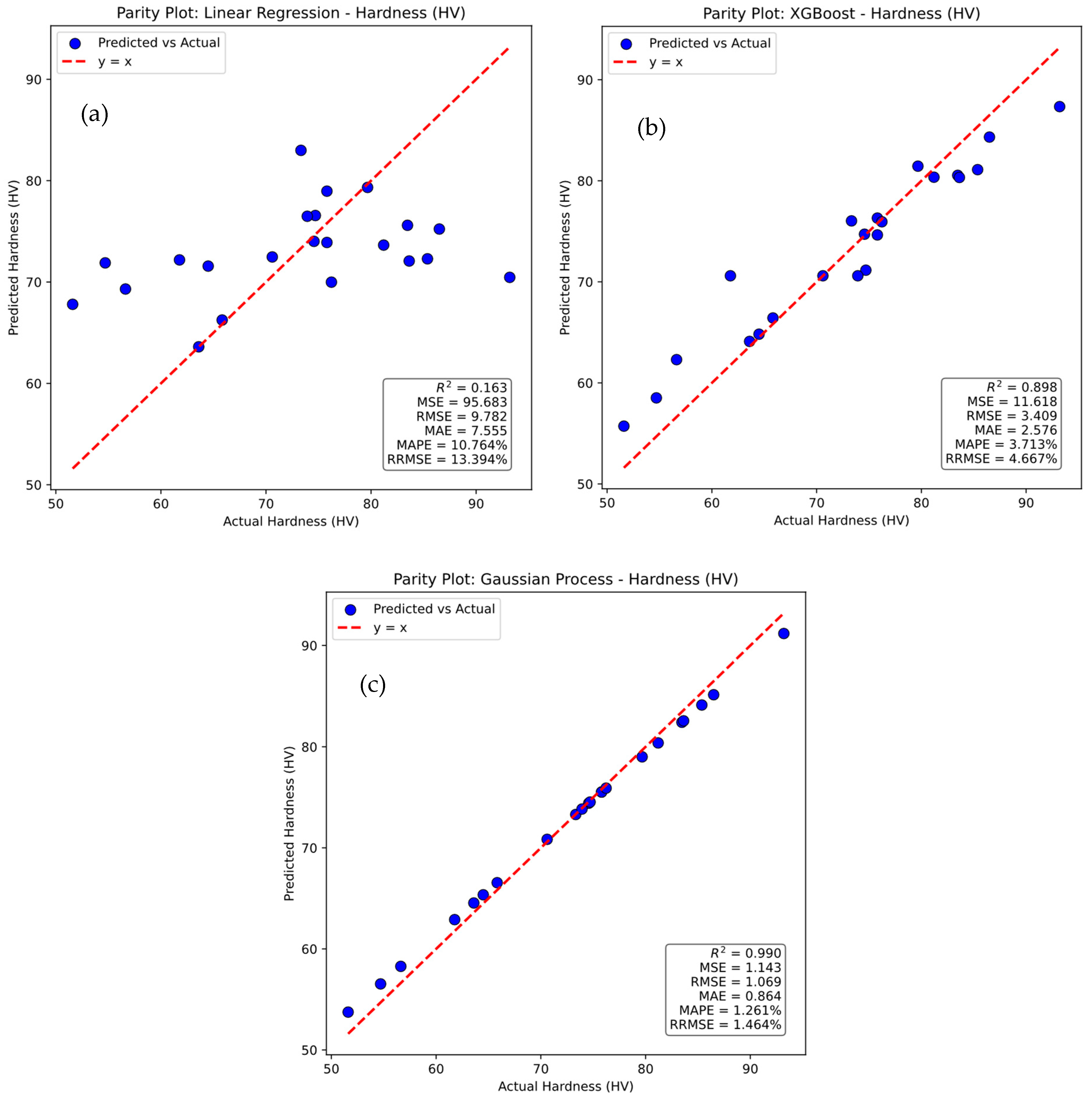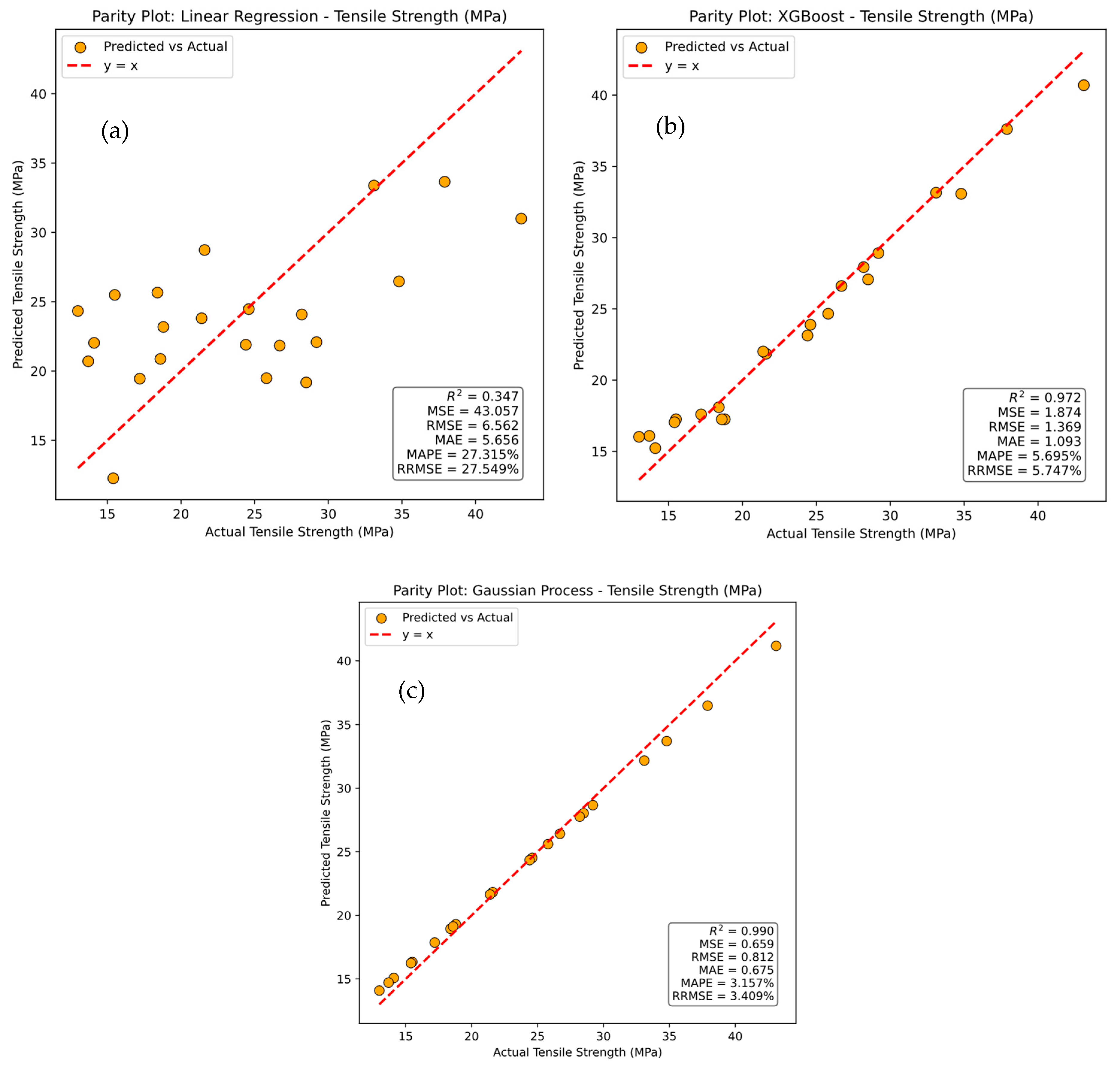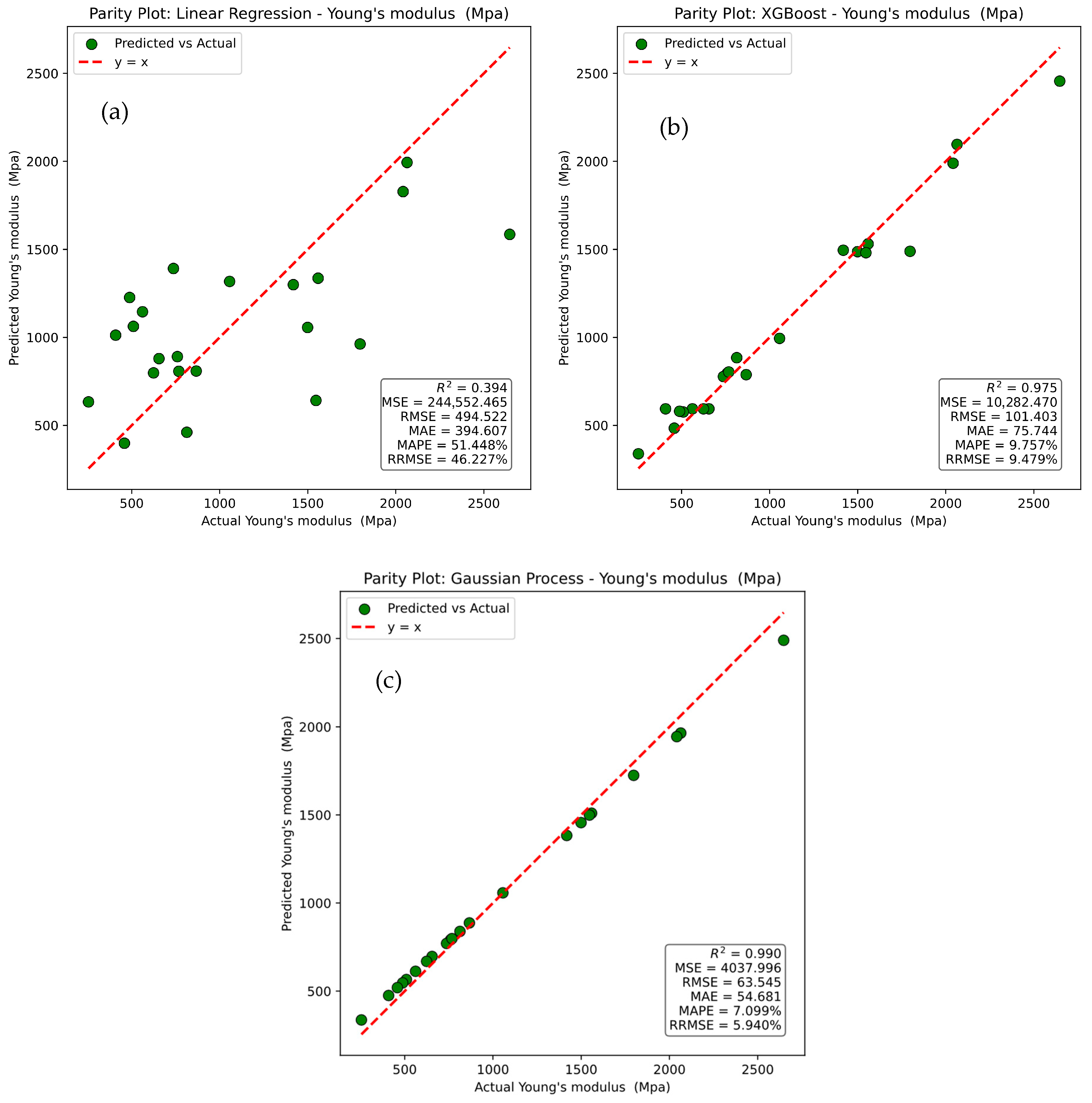 - Gaussian Process Regression and XGBoost demonstrated superior performance under the tested conditions, each exceeding R2 = 0.99 and achieving MAPE values below 4%. The Gaussian Process Regression model achieved an R2 of 0.9900 ± 0.0021, and XGBoost showed an R2 of 0.9716 ± 0.0103. These models demonstrated superior performance compared to linear regression, providing better predictive accuracy for the mechanical properties of PLA/GNP composites.