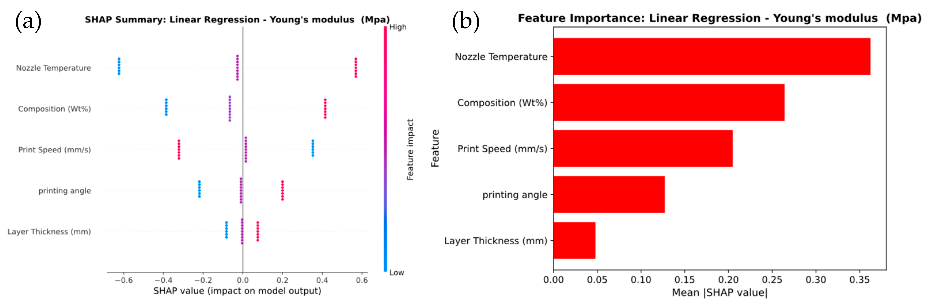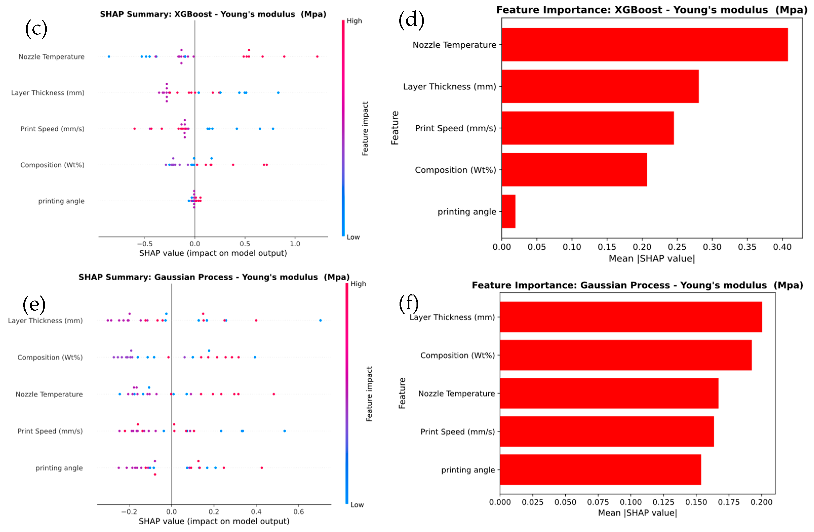 - SHAP feature importance analysis confirmed that GNP composition and layer thickness are the most influential contributors to the prediction of mechanical properties, with SHAP values reaching ±0.75, highlighting their critical roles in mechanical optimization.