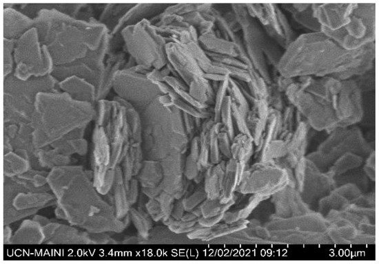 The mineralogical composition and purity of the kaolin, quartz, and pyrite minerals were determined using a D8 advance X-ray diffraction analyzer (Bruker AXS GmmbH, Karlsruhe, Germany) and TOPAS 3.0 software. Quartz was 99% pure by weight (Figure 1a). The diffraction analysis of the kaolin particles (Figure 1b) confirmed the presence of kaolinite, illite, and quartz, with kaolin being the majority phase, with a minor fraction of illite and quartz. The SEM micrograph in Figure 2 revealed a submicron population of kaolinite particles (<1 μm) with a hexagonal lamellar crystal structure undetectable with the focused beam reflectance measurement (FBRM) probe. A high-resolution SEM (Hitachi SU5000, ZRO Schottky emitter, Tokyo, Japan) equipped with Xflash 6I30 detectors (Bruker AXS GmbH, Karlsruhe, Germany) and a STEM detector (DEBEN UD Ltd., Suffolk, UK) was employed for this analysis. The pyrite was ground in a mortar and subsequently pulverized and sieved to obtain a particle size distribution between −75 µm and +38 µm. XRD analysis showed a majority composition of pyrite and a minority of chlorite (Figure 1c).