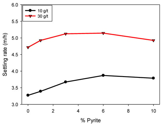 Effect of pyrite on the sedimentation rate in kaolin-quartz-pyrite tailings in seawater at pH 8, with flocculant dosages of 10 and 30 g/t. Mixing intensity, 200 rpm; solids concentration by weight, 10%.