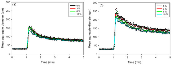 The kinetics of floc aggregation, fragmentation, and restructuring in flocculated kaolin-quartz-pyrite suspensions were analyzed using kinetic profiles obtained with the FBRM probe. The SNF 704 flocculant dosages used were 10 g/t (Figure 5a) and 30 g/t (Figure 5b). In both cases, the addition of the flocculant caused a rapid increase in floc size, reaching a maximum value a few seconds after the onset of flocculation. Both the flocculant dosage and the proportion of pyrite in suspension significantly influenced the maximum floc size.