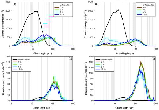 The chord length obtained with the FBRM probe is a key measure for characterizing the size of flocs or particles in suspensions, regardless of whether they are flocculated or not, due to its ability to provide an accurate measurement of the maximum particle extension, especially in systems with irregular, elongated, or complex shapes such as clays. This is especially relevant in flocculated systems, where flocs do not have a uniform geometry and their sedimentation and rheological behavior are strongly influenced by their shape. Figure 6 shows the chord length distributions in unweighted (Figure 6a,c) and quadratically weighted (Figure 6b,d) modes, for tailings composed of kaolin-quartz-pyrite in seawater, considering different pyrite proportions (0–10%). Unweighted CLD provides detailed information on smaller flocs, while quadratically weighted CLD includes information related to larger flocs, where it is more sensitive to changes in the coarse fraction [40,41].
