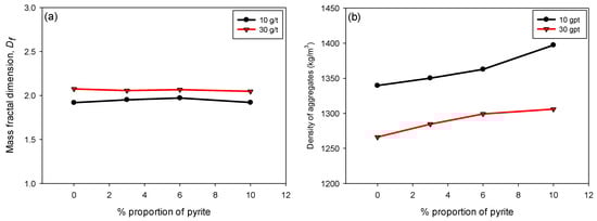 (a) Fractal dimension Df and (b) floc density, varying the pyrite content and considering flocculant doses of 10 and 30 g/t of SNF 704, with 30 s of flocculation, percentage of solids by weight of 10%, and pH 8.