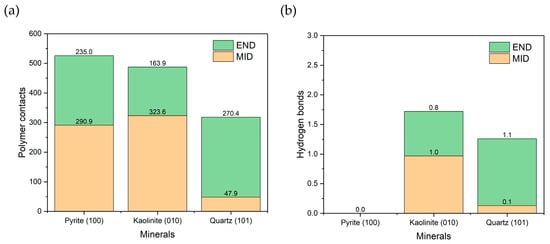 As shown in Figure 8a, pyrite had the most significant number of contacts with the PAM, closely followed by kaolinite, and to a lesser extent, quartz. The results follow the trends of previous work [46], where kaolinite had the greatest adsorption, followed by quartz. The pyrite result is interesting because only one unoxidized surface was present, yet stable adsorption was still generated. When analyzed by configuration, quartz showed greater affinity for END, while kaolinite favored the MID configuration. In the case of pyrite, no clear preference was observed between END and MID. Figure 8b shows the number of hydrogen bonds formed. No such interactions were evident with pyrite, suggesting that specific bonds do not mediate their adsorption. In contrast, kaolinite and quartz formed hydrogen bonds in proportions consistent with the observed contacts, confirming their role in the interaction with the polymer.