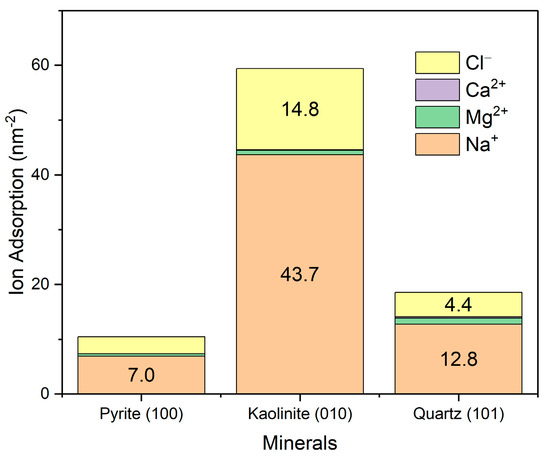 The adsorption of primary ions in seawater was evaluated by integrating the density profile, assuming the system had achieved a stable ionic distribution. As shown in Figure 9, ions exhibit the highest adsorption on the (010) edge surface of kaolinite, followed by quartz and, to a lesser extent, pyrite. It is important to note that these results correspond to specific surface planes, which can significantly influence the observed adsorption. In the case of quartz and pyrite, surfaces with close to isotropic symmetry were studied, while kaolinite displays a strongly anisotropic character. In particular, the (010) surface of kaolinite is recognized for its high reactivity and charge density, in contrast to its basal (001) planes, which show a much lower ionic adsorption capacity. Therefore, the overall adsorption of ions on kaolinite could be overestimated if only its exposed edges are considered. Regarding the adsorbed ionic composition, sodium was the most retained ion, followed by magnesium, while calcium and chloride showed significantly lower adsorptions.