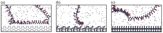 Figure 10 presents the final adsorption configurations of the anionic polymer PAM on the three mineral surfaces. These visualizations confirm the trends observed in previous analyses. On pyrite, adsorption occurs primarily through the aliphatic segments of the polymer, suggesting a more versatile behavior less dependent on charged functional groups. This type of interaction could be favored by the less polar nature of the surface. In contrast, on kaolinite and quartz, adsorption occurs mainly through carboxylic and amide groups of PAM, in line with their higher surface charge density (in the case of kaolinite) and presence of hydroxyl groups. These results show that polymer adsorption depends not only on surface charge but also on the structure and local chemistry of the surface, making it difficult to predict from simple parameters.