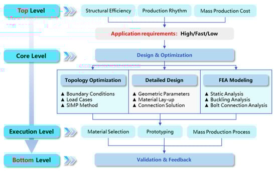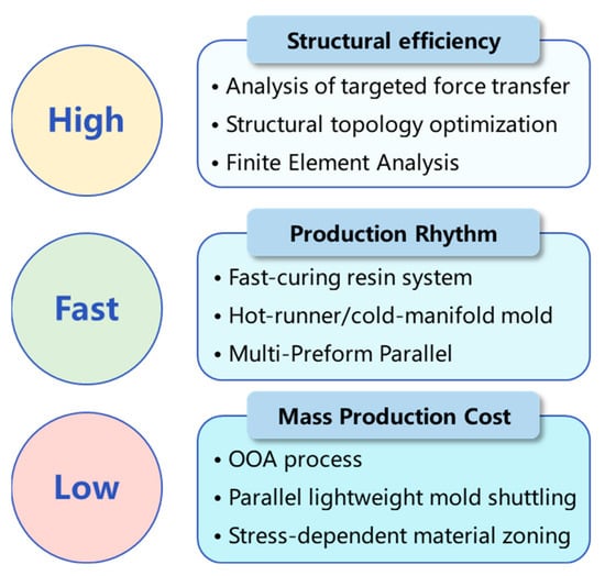 Figure 1 illustrates that the proposed application-oriented design concept encompasses enhancing structural efficiency, expediting production rhythm, and diminishing mass production cost. For high structural efficiency, the analysis should commence with targeted force transfer, followed by structural topology optimization and finite element modeling to assess structural integrity and rigidity. For low production rhythm, the fast-curing resin system method is utilized, integrated with hot-runner/cold-manifold molds and the multi-preform parallel approach to establish an integrated strategy. For low mass production cost, the out-of-autoclave (OOA) process is adopted, while parallel lightweight mold shuttling and stress-dependent material zoning also play a positive role.