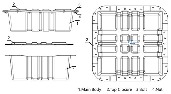 Based on the topology optimization results in Section 2.2 and combined with the force analysis, the structural design was carried out. The assembly of the designed battery container is shown in Figure 3. The whole container consists of four parts: the main body, the top closure, the bolts, and the nuts. Correspondingly, the 3D model is shown in Figure 4. To decrease the structural weight, the load-bearing area in the middle of the box and the lid was partially thickened (purple area) in accordance with the topological optimization result. While the thickness of the surrounding area was reduced (green area), as illustrated in Figure 5. The dimensions of the lightweight FRP battery container structure are detailed in Table 2.