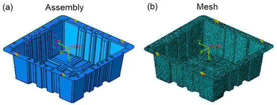 The commercial Abaqus/CAE software with 2021 version was adopted for finite element analysis modeling, and the FEA model of the suspended static bottom loading condition, as shown in Figure 6. The bottom static strength verification model uses shell elements to fasten the four fixing bolt holes, which applies 1200 N on the bottom of the box. Since shell elements are used to simulate thin-walled structures, it is necessary to extract the mid-plane geometry of the bottom of the box and ignore details, such as filets, and bosses, that have little impact on the overall stiffness. The S4R four-node reduced integration shell element is suitable for general thin-walled structure analysis, which can effectively balance calculation accuracy and efficiency.