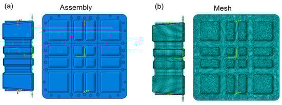 Finite element model of the lateral compression loading condition: (a) assembly condition; (b) mesh condition.