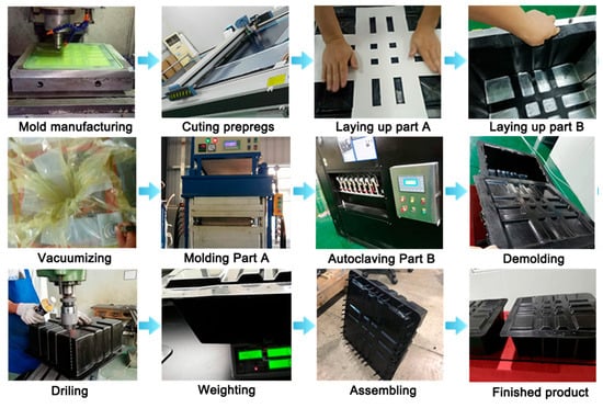 - A high-efficiency and cost-effective manufacturing strategy was established for industrial mass production of the CFRP battery-pack enclosure. It was achieved by selecting fast-curing prepregs and optimizing design to achieve a rapid curing cycle of 10–15 min. Furthermore, rigorous cost-control measures across production stages ensured that the target cost per unit was below ¥1000, which guarantees its commercial market.