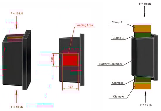 As shown in Figure 10, the battery cap was connected and installed with the main body, and bolts were installed in all connection holes during lateral crush verification. The envelope dimensions of the displacement deformation are 330 mm × 330 mm to prevent contact with the battery. Before testing, the load was initially applied at a rate of 5 mm/min to a force of 50 N and maintained for 5 s, and the deformation was reset. The quasi-static loading method was employed, in which the load was maintained for 3 s and then unloaded. A qualified battery container should have a maximum deformation of no more than 20 mm at the base and display no apparent damage to the connecting holes following the removal of the bolts. The 10 kN lateral compression load was chosen as the standardized and targeted performance threshold to validate a critical safety requirement. Specifically, the maximum deformation under the applied load did not exceed 20 mm, and there was no visible damage after the experimental test, which provided structural integrity and occupant safety.