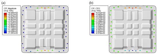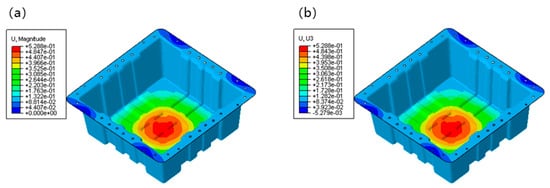 Figure 11a presents the distribution of total displacement magnitude (U, Magnitude) of the lightweight CFRP battery enclosure. A transparent gradient of displacement was observed, with the maximum displacement occurring at the central region of the container’s bottom, indicated by the red color. The maximum deformation after loading was about 0.53 mm, which met the deformation requirements of the bottom static test. This central concentration of displacement is likely due to the structural geometry and load-bearing characteristics, where the central area may experience more significant deformation under the applied loads. The displacement gradually decreased from the center to the edges, as shown by the transition from red to blue colors. The corner regions exhibited relatively low displacement, which can be attributed to the boundary constraints and the stiffening effect of the container’s peripheral structure. This deformation pattern and the achieved low displacement value are consistent with the performance of high-quality CFRP structures reported in the literature [21,23,27]. It was confirmed that similar structural efficiency was achieved with the fast-curing prepreg system, which was crucial for mass production.