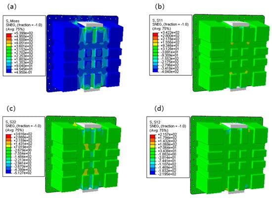 FEA results of stress in lateral loading condition: (a) Mises; (b) S11; (c) S22; (d) S12.