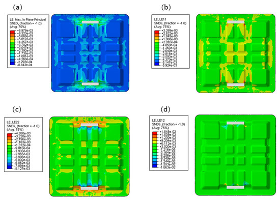 FEA results of stress in lateral loading condition: (a) Max. in-plane principal; (b) LE11; (c) LE22; (d) LE12.
